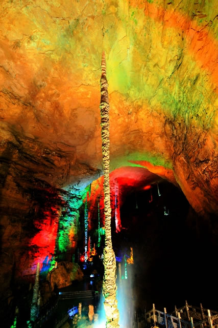 雪松是龍宮的第三大奇觀,也是黃龍洞內生長速度最快的一根石筍,它通體雪白,高達17米,巍然聳立在龍宮大廳西端的斜坡上,“大雪壓青松,青松挺且直”就是它的真實寫照!把┧伞钡目茖W名稱叫棕櫚狀石筍,是洞頂?shù)嗡捌洚a生的飛濺水共同作用的結果,一般只有在空間較為高大的廳堂才能看到。根據(jù)其根部的棕櫚片取樣分析,“雪松”挺立在這里已經有9.6萬年的時間了,因此也叫它“萬歲松”。