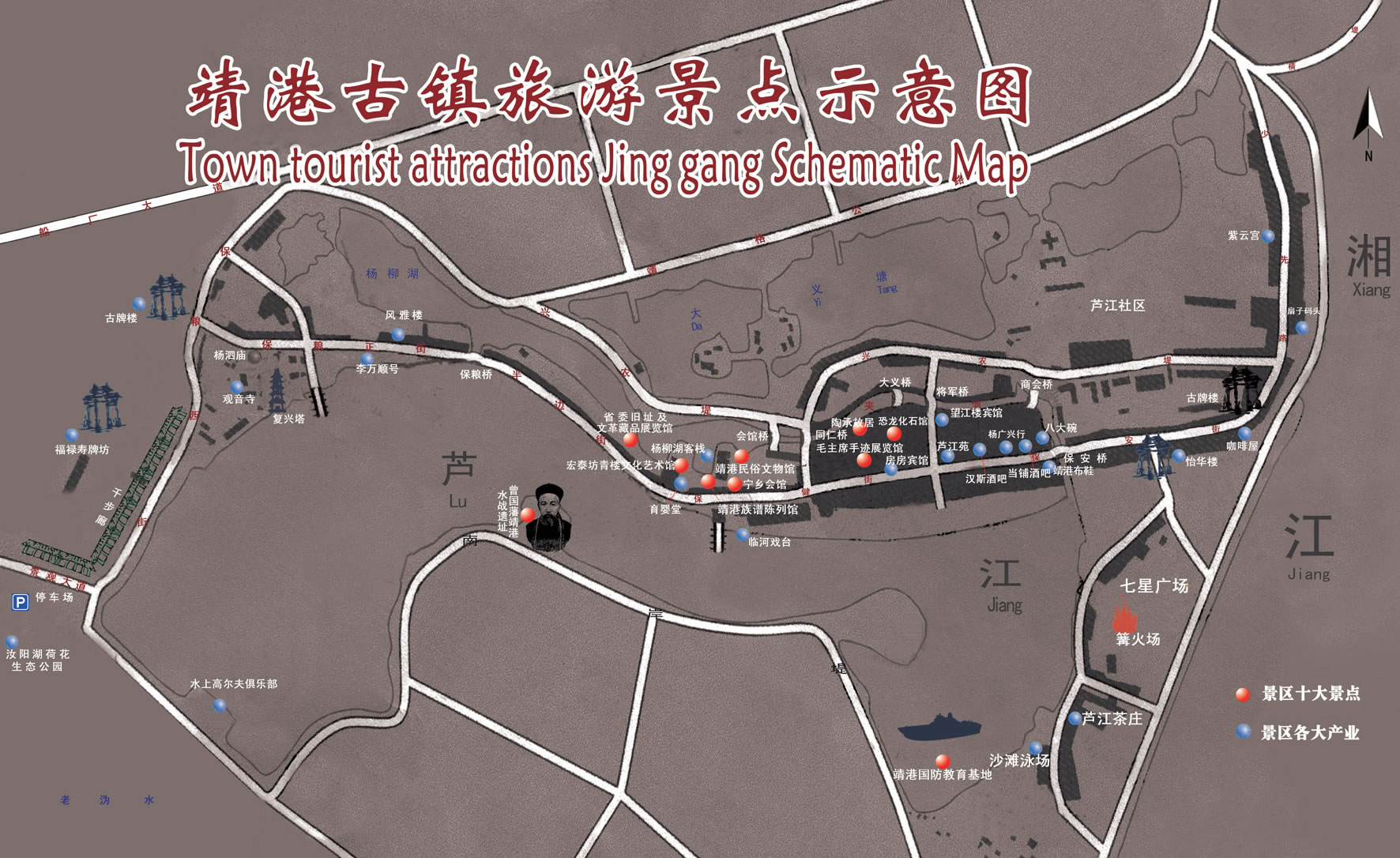 靖港,原名蘆江,地處溈水入湘江口,多洲灘,蘆葦叢生,故名。唐武德四年,內(nèi)亂頻仍,高祖皇帝李淵派大將軍李靖南下戡亂。李靖駐兵蘆江,“軍令嚴整,秋毫無犯,百姓德之,名其水曰靖港,以志不忘!庇谑,蘆江始更名靖港。逮及清末民初,航運業(yè)日趨發(fā)達,靖港以其天然良港之優(yōu)勢,成為船只進出長沙的北大門和避風港,每天?康拇粩(shù)以千計。湘陰、益陽、寧鄉(xiāng)及本地糧食土產(chǎn)多在此集散,曾為湖南四大米市之一,商賈云集,市場活躍,時稱“小漢口”。當時流傳著一句俗語,“船到靖港口,順風也不走”,足見其盛。 古鎮(zhèn)現(xiàn)保存“8街4巷7碼頭”,民居1008棟,主街道長1275米,有數(shù)十處古商鋪、作坊、會館、廟宇和極具紀念意義的遺址,其中,“宏泰坊”、“寧鄉(xiāng)會館”、“當鋪”、“育嬰堂”等明清古建筑保存較為完好。原臨河所建房屋均為吊腳樓,獨具江南水鄉(xiāng)特色,蔚為壯觀。古鎮(zhèn)內(nèi)遠近聞名的還有“復(fù)興塔”、“觀音廟”、“紫云宮”等數(shù)處宗教建筑,朝有千人作輯,夜有萬盞明燈,香火旺盛,場面壯觀。 2008年7月,靖港古鎮(zhèn)保護與開發(fā)正式啟動,同年9月,靖港鎮(zhèn)榮獲“中國歷史文化名鎮(zhèn)”稱號,古鎮(zhèn)的保護與開發(fā)已納入省、市重點工程。作為中國歷史文化名鎮(zhèn),靖港的發(fā)展目標定位為國家5A級旅游景點,成為長株潭城市群中獨具特色的都市型休閑度假基地。