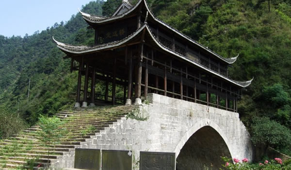 定遠(yuǎn)橋位于綏寧縣關(guān)峽鄉(xiāng),是綏寧縣知縣范成龍捐獻(xiàn)自己的俸祿銀子于康熙二十三年(1684年)修建。橋長(zhǎng)一十二丈六尺,寬二丈六尺,高五丈六尺,單孔,半圓拱。橋面用青石鋪面,青石已被磨得油亮發(fā)光,橋頂屋架木瓜、懔條緣皮、青瓦翹檐、瓦頭潔白,橋依山而建,古樸威嚴(yán);亭為杉木架構(gòu),卯榫嵌合,不用一釘,圓石為礎(chǔ),巨木為柱,片板為欄,長(zhǎng)方為座,可供憩息,可避風(fēng)雨。由于這里的險(xiǎn)關(guān)隘口天然生成,為歷代兵家要塞,故名關(guān)峽;現(xiàn)為湖南省保護(hù)文物;