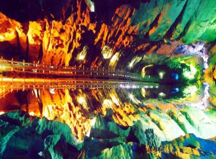 一條小溪穿洞而過(guò),水流平緩,燈光打在巖壁上,皺襞倒影在水中,如夢(mèng)如幻。巖洞用五光十色的霓虹燈打在石筍、石幔及石花上,營(yíng)造出...