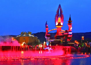 遮掩不住的綠意、隨風起舞的樹影、奇思妙想的雕塑。每處景致都在極力烘托各區(qū)域的主題特色。漫步在嬉戲谷,收獲的不僅是自然的靈感、生活的情趣,更有讓人禁不住會心微笑的細節(jié)和不經意間心靈的震撼。最美不勝收的樂園中心的“精靈湖”,湖中挺立著一座精致典雅、風格獨特的“神秘之島”,湖島相連,脈脈依依,給人以無盡想象,續(xù)寫著不朽的浪漫傳奇,夜晚。彩色噴泉與夜色相交,體現出與自然景色不一樣的美-------科技美。