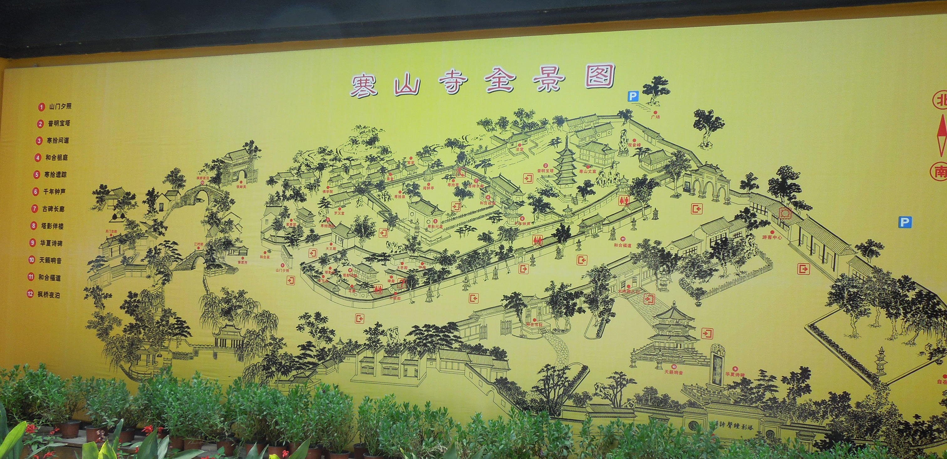 寒山寺的主庭園左側(cè)的花壇兩面嵌長(zhǎng)條石刻兩塊,一為明代崇幀年間刻的"寒拾遺蹤";另一刻清末江蘇巡撫程德全寫(xiě)的"妙利宗風(fēng)"。出大雄寶殿,左通普明寶塔和方丈室,右達(dá)名聞遐邇的聽(tīng)"夜半鐘聲"的鐘樓,正前方的兩層屋宇是藏經(jīng)樓。遠(yuǎn)望屋頂,可見(jiàn)唐僧、孫悟空等西天取經(jīng)塑像群。藏經(jīng)樓樓上秘藏珍貴佛經(jīng),樓下叫"寒拾殿",寒拾殿后墻的背面立一巨碑,刻著千手千眼觀(guān)音、韋馱和關(guān)公等人物。鐘樓就在寒拾殿旁。