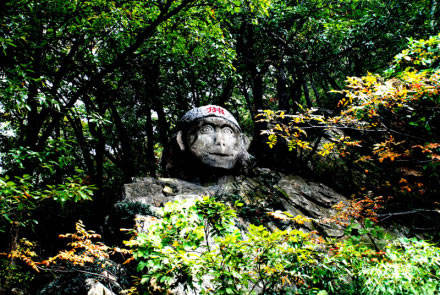大圣佛是在自然石的基礎(chǔ)上,鑿刻而成的孫大圣頭像,供孫大圣的信仰者祭祀。孫悟空保護(hù)唐僧西天取回真經(jīng),功德圓滿,被如來封為斗戰(zhàn)勝佛,地位已遠(yuǎn)遠(yuǎn)高于觀音菩薩。斗戰(zhàn)勝佛,顧名思義是好斗善斗,而且是凡斗必勝。在人們心目中,孫悟空就是正義的象征,智慧的象征。每年臺灣地區(qū)和東南亞各國,都有很多進(jìn)香團(tuán)到花果山來朝拜孫大圣。