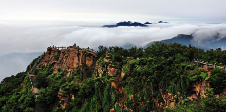 從遠(yuǎn)處山腰眺望一線天,這里就是著名的八戒石.很像一個戴著僧帽的老豬在綠樹叢中呼呼大睡。一線天下面是花果山山名摩崖石刻,游客都愛在這里留影,青山紅字,非常壯麗。這里還有天然碑、硯石等景觀。沿小路前進(jìn)可至墨香小徑,里面有百余位當(dāng)代書法名家的作品刻在天然石塊上;還可至怪石園,看千奇百怪與《西游記》有關(guān)的象形石。“神”字王在東部禿龍溝下,是刻在山體上的懷素草書“神”字,長39.4米、寬15.8米,為世界上最大的單體漢字,1996年被載入吉尼斯世界紀(jì)錄。 登上玉女峰是花果山之游的高潮,有緣的人在這里可看到云臺山兩個最為精彩的景致。一個是在迎曙亭看海上日出;另一個是看云臺鋪海,白云翻滾好像海水揚(yáng)波,露出來的峰頂就像大海里的蓬萊仙島,群山俯伏,阡陌縱橫,此情此景令人有飄飄欲仙的感覺。