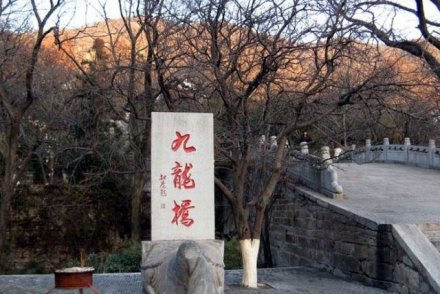 九龍橋是因?yàn)樯缴嫌芯艞l山澗像九條舞動著的龍,從四面八方匯集于橋下而得名。那時候百姓都相信龍是神,一些香客就在此橋小憩一刻,來沾一點(diǎn)龍的壽氣,再進(jìn)山求佛,保全家萬事平安,因此九龍橋又叫萬壽橋。傳說花果山上原來有十條龍,九條龍?jiān)谏嚼锩孀≈,為了防止外族侵犯,便派了一條本事最大的禿龍到東面的山頭守衛(wèi)。山東莊還有禿龍山,那龍山上還有兩個對穿的山泉就是傳說中的龍耳。我們可以在橋上往南望,那遠(yuǎn)處的村莊便是山東莊。九龍橋畔有一棵千年老銀杏,粗大的枝椏已經(jīng)擠進(jìn)了橋身,橋上橋下布滿樹蔭,給游客提供了休息納涼的理想場所。