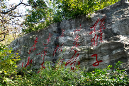 在一塊塊自然山石上,鐫刻著當(dāng)代書法名家的作品,因名“墨香小徑”。踏入這條小徑,便會為104塊天然石上的書法瑰寶所陶醉。字因石愈顯其秀,石因字更顯其神。真草隸篆,形體各異;顏肌柳骨,風(fēng)韻不同。啟功、沈鵬、李苦禪、沙孟海、林散之、武中奇、范曾、舒同、李淑一、蕭嫻、李一氓、郭化若等位大師的真跡,為勝境錦上添花。