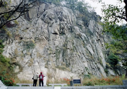 唐僧崖,又叫“大佛崖”,是由片麻巖石風(fēng)化而成的一堵高達(dá)數(shù)十米的峭壁陡崖。站在三元宮停車場東望,即可見唐僧和孫悟空師徒倆立在崖上的形象:唐僧兩耳垂肩,佛眼微閉,背稍躬,好像正在肅目修行;右旁一天然石猴,似乎在與唐僧耳語。神采逼真,栩栩如生。走到近前,由于崖壁紋理復(fù)雜多彩,還可以看到許多奇景點(diǎn)綴其間,有師徒對話、舍身飼虎、獨(dú)角鬼王等,所以有人又把它叫做“萬佛崖”。