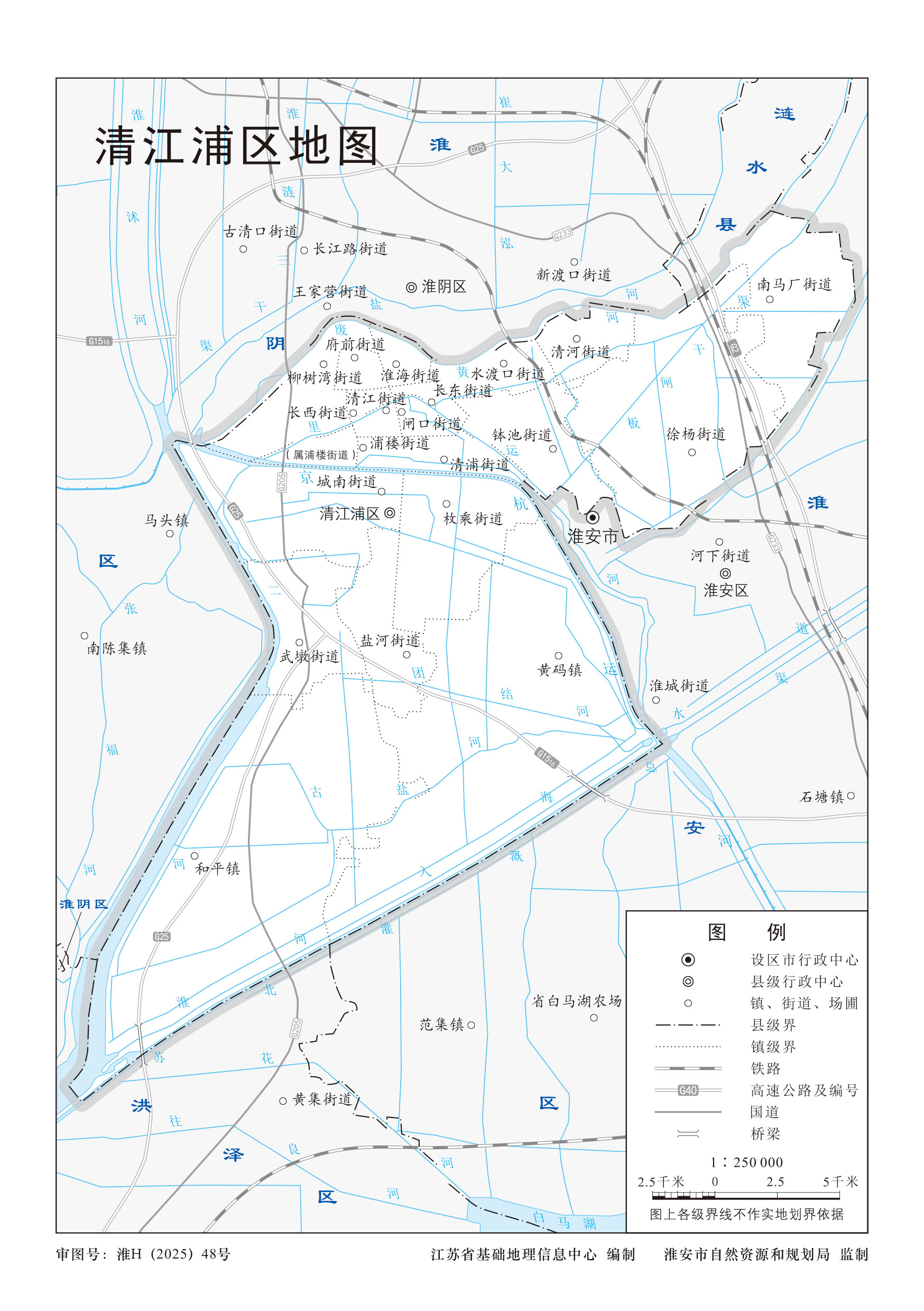 街道:城南街道、清江街道、浦樓街道、閘口街道、清浦街道、府前街道、長西街道、淮海街道、長東街道、柳樹灣街道、水渡口街道、清河街道、武墩街道、鹽河街道、缽池街道、徐楊街道、南馬廠街道、枚乘街道