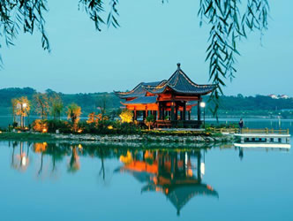 湖心亭位于湖東北部之湖心島上,磚木結(jié)構(gòu),四方八角,古典形式,建筑面積112.84平方米。亭周圍繞以100米道板路。