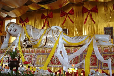 釋迦牟尼涅槃像由名貴的緬甸白玉精雕細(xì)琢而成。白玉毛料1999年在緬甸發(fā)現(xiàn),歷經(jīng)三年艱苦開采,始現(xiàn)于世。玉料為一塊完整一體的純天然玉料。據(jù)玉材的天然造型,經(jīng)過精心設(shè)計(jì),由德純藝高的工匠歷兩年時(shí)間精工雕成。佛像長(zhǎng)8.9米,高2.45米,總寬1.35米,體型比例均確。玉佛全身鑲嵌有1500多粒紅、藍(lán)、紫晶寶石和翡翠,衣紋和蓮花臺(tái)由24K黃金鎦金而成,彩繪部分采用天然石色彩畫而成。
