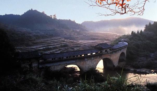 玉帶橋:因其弧形如玉帶,故名。玉帶橋?yàn)楫?dāng)?shù)馗晃逃囡L(fēng)歧募資建于清乾隆五年(公元1740年),又名“風(fēng)歧橋”。玉帶橋?yàn)槎杖孜輼鞘焦皹颍瑯蛏沓苫⌒,橋長88.15米,是江南現(xiàn)存最長的弧形廊橋,它以結(jié)構(gòu)獨(dú)特,氣勢雄偉而聞名贛粵。留下了“遠(yuǎn)近聞名玉帶橋,兩岸峻峰入云霄。奔騰河水瀉千里,玉帶飛鎮(zhèn)兩山腰”的贊譽(yù)。