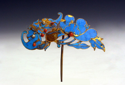 清點翠頭簪:用珊瑚、珍珠制成。整個主題為蝶戀花,蝴蝶在花下,一花開放,旁有兩朵含苞欲放的花,蝴蝶和花均為藍色,應(yīng)為翠鳥毛制成,花瓣為兩層,均為五瓣,花蕊用珊瑚制成,兩花苞微微下耷,蝴蝶的翅膀為展開狀,蝴蝶的眼睛及翅膀上均有珊瑚珠。