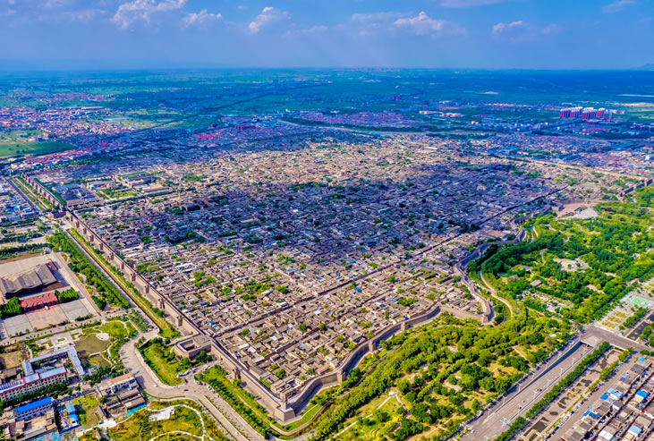 平遙古城,位于山西省中部,始建于西周宣王時(shí)期(前827年—前782年),于明代洪武三年(1370年)重建、擴(kuò)修城池,是現(xiàn)今中國(guó)境內(nèi)保存最為完整的一座古代縣城,整座城池宛如烏龜向南爬行,因此有“龜城”之稱。平遙古城由城墻、店鋪、街道、寺廟、 民居等共同組成一個(gè)龐大的建筑群,整座城池對(duì)稱布局,以市樓為軸心,以南大街為軸線,形成左城隍、右衙署,左文廟、右武廟,東道觀、西寺廟的封建禮制格局,總占地面積2.25平方千米;城內(nèi)街道格局為“土”字形,整體布局遵從八卦方位,由四大街、八小巷、七十二條蚰蜒巷構(gòu)成八卦圖案,南大街、東大街、西大街、衙門街和城隍廟街形成干字型商業(yè)街。