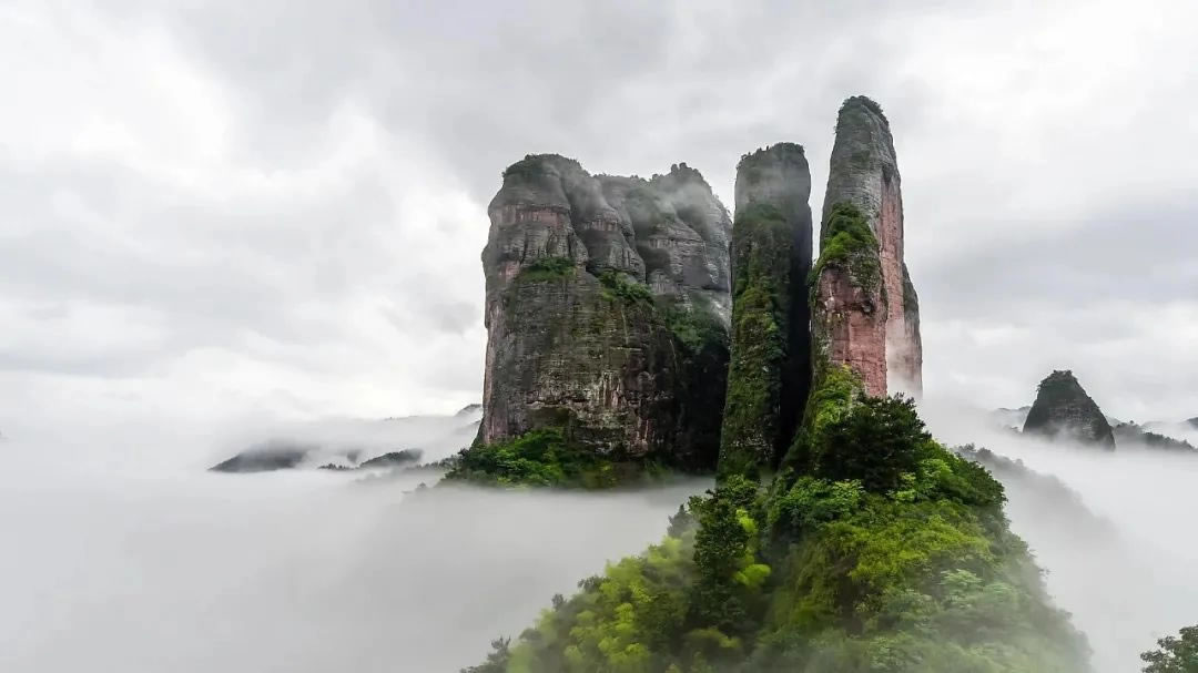 - 特色:江郎山的標志性景觀,由三塊巨石組成,形似石筍天柱,被譽為“神州丹霞第一峰”。