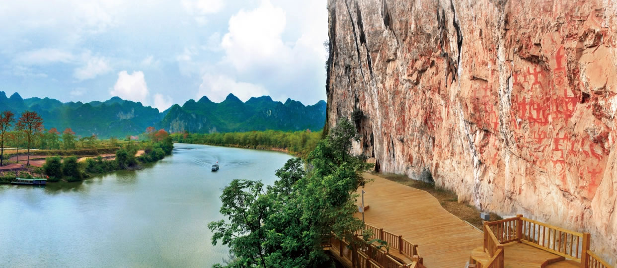 - 觀賞紅色人像、銅鼓、渡船等圖案,最大人物圖像高達(dá)3.58米,感受古代駱越人的藝術(shù)成就。