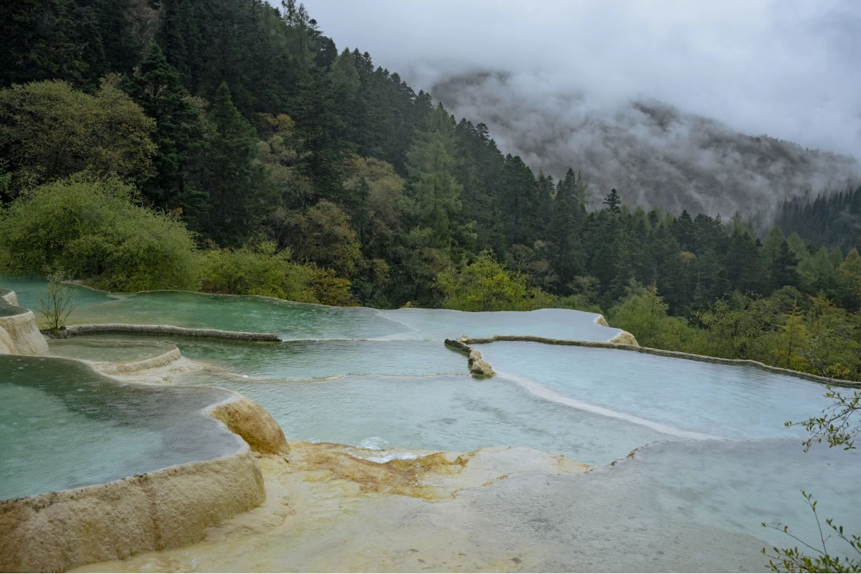 黃龍景區(qū),位于四川省阿壩藏族羌族自治州松潘縣,是中國(guó)唯一保護(hù)完好的高原濕地,在一條由南向北逐漸隆起的山脊上。黃龍風(fēng)景名勝區(qū)面積700平方千米,與九寨溝相距100千米,海拔1700~5588米。黃龍風(fēng)景名勝區(qū)核心區(qū)域點(diǎn)綴著三千多個(gè)彩池。以結(jié)構(gòu)奇巧、色彩豐艷的地表鈣華景觀為主景,由黃龍溝、丹云峽、牟尼溝、雪寶鼎、紅軍長(zhǎng)征紀(jì)念碑碑園等組成。主要景觀集中于雪寶峰下的黃龍溝中,溝內(nèi)遍布乳黃色的碳酸鈣華沉積,并呈梯田狀排列。從頂峰流下的雪水匯聚成溪,在黃龍溝形成層層疊疊的梯狀湖泊、池沼,池水澄清無(wú)塵,水色因水底沉積物和樹(shù)木、山色的變化而呈現(xiàn)黃、綠、淺藍(lán)、蔚藍(lán)等顏色。