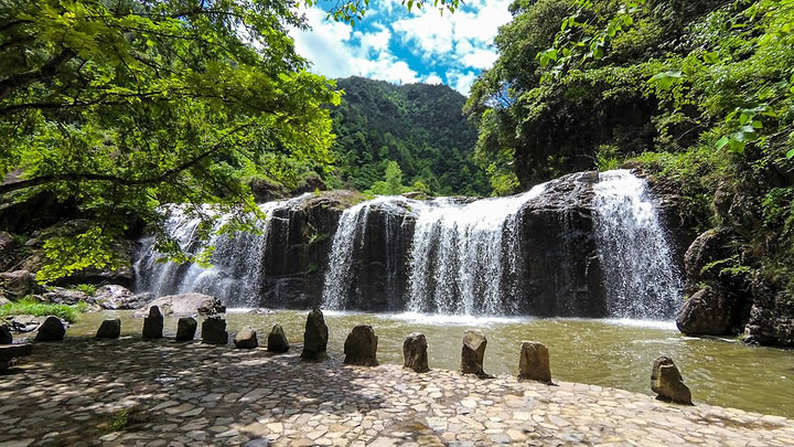 - 核心特色:以峽谷漂流為核心,融合自然奇觀(石林飛瀑、三仙巖、萬年古河床)、生態(tài)探險(xiǎn)(高空溜索、飛躍山澗)及非遺文化(土著宴、刀山火海表演)。2022年新增漂流拓展區(qū)、浮橋等設(shè)施,被譽(yù)為“浙江第一漂流”。