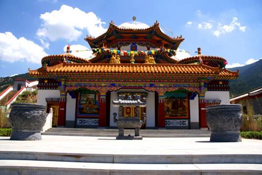 廣宗寺,其整個(gè)建筑氣勢(shì)宏偉,富麗堂皇。主要建筑有大雄寶殿、大經(jīng)堂、黃樓寺等。其中供奉西藏第六世達(dá)賴?yán)镞z體寶塔的大殿稱為“黃樓寺”。黃樓寺是一座兩層樓閣的建筑,其前部為81間,后部為49間,全部用黃、綠色琉璃瓦砌成,極為富麗。