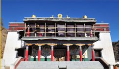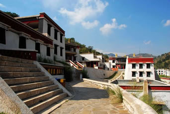 喇彌仁殿(菩提道學(xué)經(jīng)堂),又稱日木倫殿。建于光緒十八年(1892年),位于護(hù)法殿后邊西北高聳的山坡上,為教義戒律學(xué)部,這個學(xué)部在內(nèi)蒙地區(qū)藏傳佛教寺院中只有五當(dāng)召設(shè)立。是召廟建筑群中建造年代最晚的建筑物。殿內(nèi)正中供奉銅鑄高九米的黃教創(chuàng)始人宗喀巴坐像。左右兩側(cè)塑其兩大弟子嘉曹杰和克珠杰塑像。兩側(cè)木龕內(nèi)有一千尊一模而成的宗喀巴塑像。二樓凸起的天窗既可容納高大的塑像,又可采納光線,顯示了獨具匠心的藏傳佛教寺廟建筑特點。