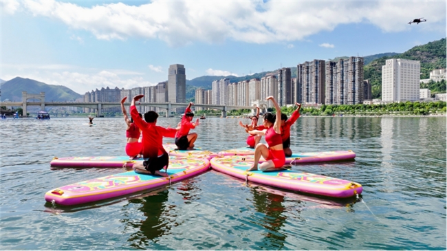青田地處浙江省東南部,甌江中下游,山水資源豐富,水域總面積超100平方公里,水資源常規(guī)指標(biāo)遠(yuǎn)遠(yuǎn)優(yōu)于全國、全省平均水平,環(huán)湖綠帶鑲嵌著豐富的歷史人文景點,湖岸城市風(fēng)光與大自然風(fēng)光融為一體,槳板與瑜伽擦出水上火花。