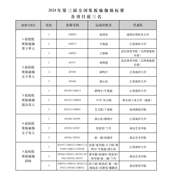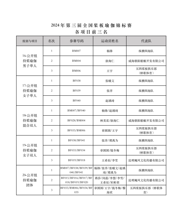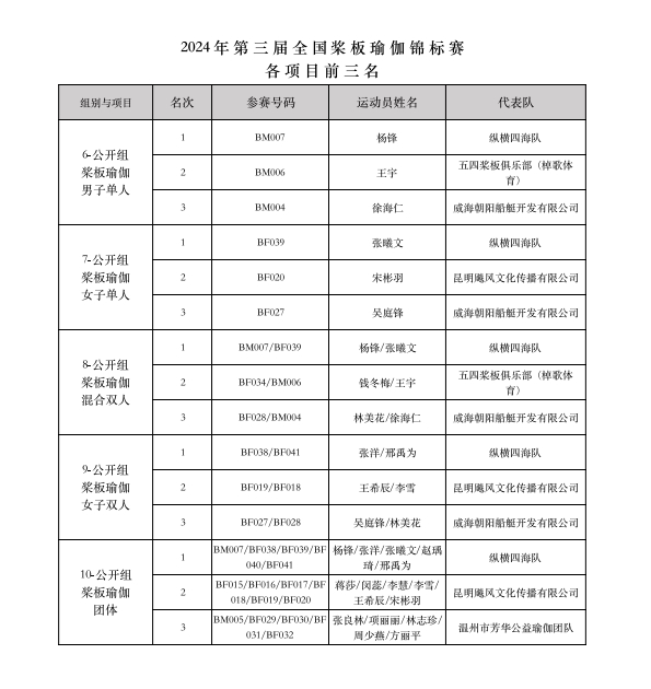 最終經(jīng)過為期兩天的激烈競賽,“意爾康杯”2024年第三屆全國槳板瑜伽錦標(biāo)賽共決出槳板瑜伽、持槳瑜伽、槳板體適能等3大類共22項比賽各項前三名的獲獎名次。