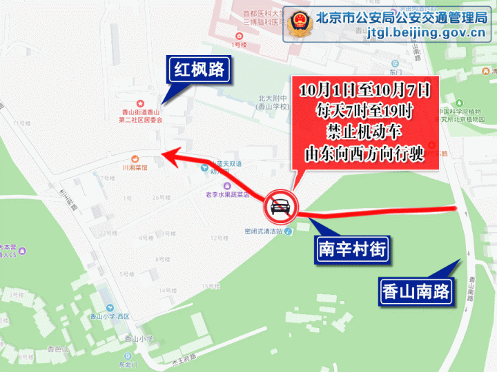 10月1日至10月7日,每天7時(shí)至19時(shí),海淀區(qū)南辛村街(紅楓路至香山南路段)禁止機(jī)動(dòng)車由東向西方向行駛。