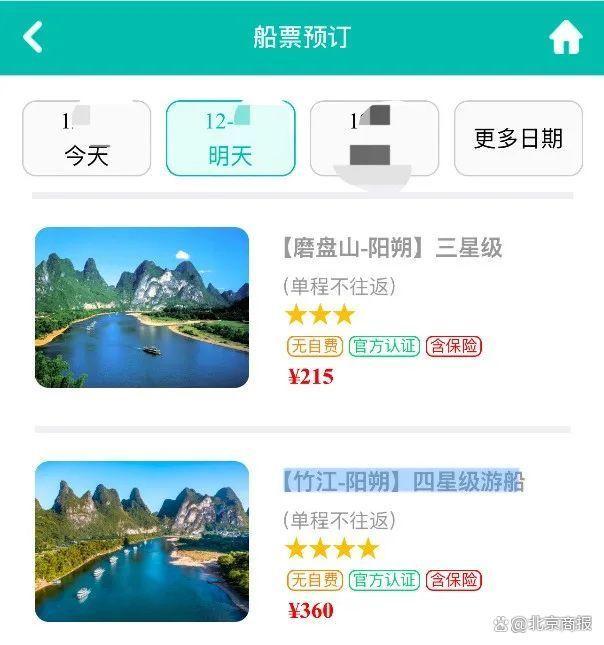 進一步來看,漓江風(fēng)景區(qū)船票購買界面提供的215元的“【磨盤山-陽朔】三星級”和360元的“【竹江-陽朔】四星級游船”選項中,雖然顯示“含保險”,但并未說明保費與承保的保險公司,乃至保障責(zé)任等信息。