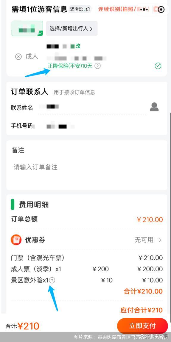 比如,游客在黃果樹瀑布景區(qū)官方線上渠道購票時,在提交訂單界面,會捆綁有一份“景區(qū)意外險”,顯示為10元。當記者填寫完身份信息后,在身份信息旁會出現(xiàn)“正隆保險(平安)10天”字樣,并且進行了默認勾選,如果不需要購買保險,則需要取消該選項的勾選。