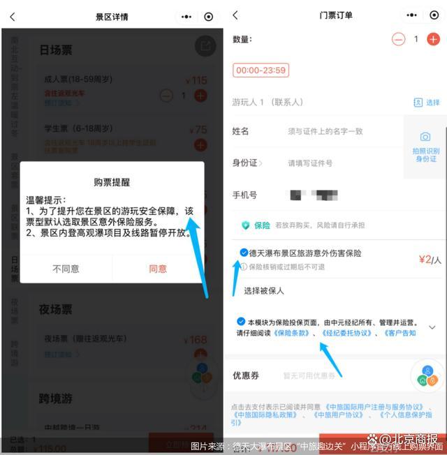 廣西德天大瀑布景區(qū)的官方線上購票渠道在選擇“日場票”(成人票)后,會提示“為了提升您在景區(qū)的游玩安全保障,該票型默認選取景區(qū)意外保險服務(wù)”。進一步來看,該景區(qū)默認勾選的保險為“德天瀑布景區(qū)旅游意外傷害保險”,并在保險名稱下方標有“本模塊為保險投保界面,由中元經(jīng)紀所有、管理并運營”。