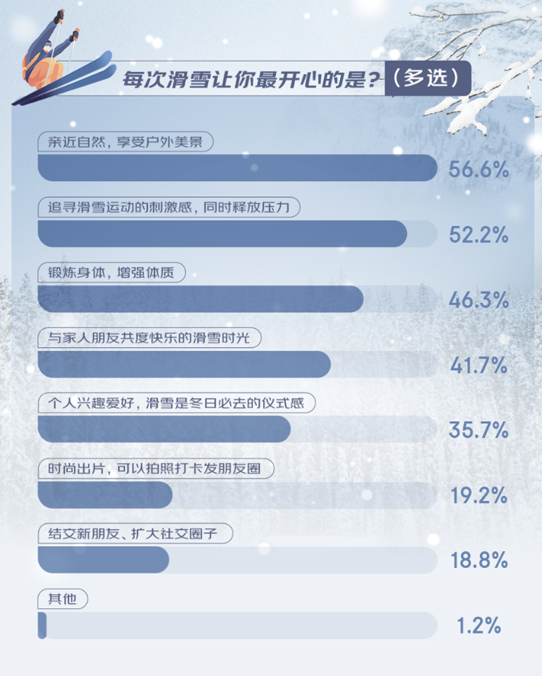 來自深圳的年輕程序員林小嫻是一名滑雪發(fā)燒友。自前年自己首次嘗試滑雪,便被雪道上飛馳的自由與刺激深深吸引,她感慨地說:“滑雪讓我重新定義了冬季的樂趣,每一次滑行都是一次心靈的釋放。”在調研中,許多人表達了對滑雪帶來的自由、挑戰(zhàn)與樂趣的深切熱愛,有56.6%的人表示,親近自然、享受美景是他們滑雪時最開心的時刻;52.2%的人渴望追尋滑雪運動的刺激感、釋放壓力;此外,強身健體、與家人朋友共度時光、結交新朋友也是滑雪讓人開心的體驗。