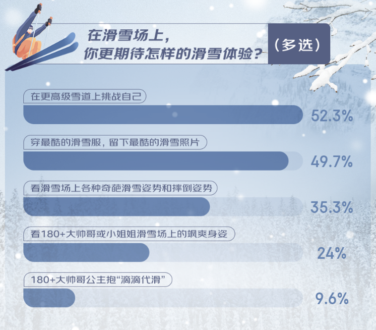 滑雪運動的持續(xù)“擴圈”,也讓滑雪愛好者們對于滑雪體驗的期待日益多元。超半數(shù)人希望在更高級的雪道上挑戰(zhàn)自我,感受速度與激情的碰撞;有49.7%的人期待穿上最酷的滑雪服,留下最炫的滑雪照片;還有24%的人表示來雪場期待看到帥哥、美女的颯爽滑雪身姿。