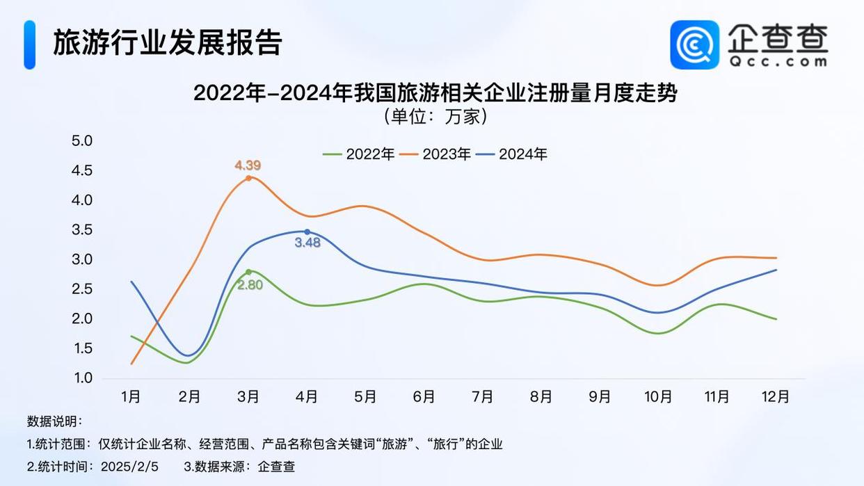 企查查數(shù)據(jù)顯示,2024年,我國累計注冊31.3萬家旅游相關(guān)企業(yè),分月份來看,4月相關(guān)企業(yè)注冊量達(dá)3.48萬家,是全年注冊量最高月份;從2022年至2024年我國旅游相關(guān)企業(yè)注冊量月度分布來看,每年的3月、4月是旅游相關(guān)企業(yè)注冊高峰期。
