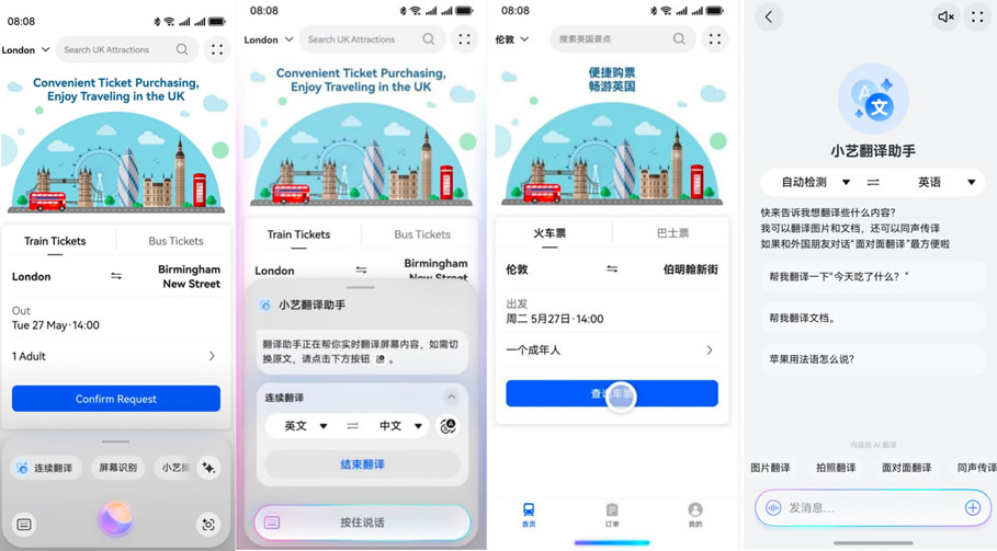 當(dāng)然,小藝的能力遠不止于此。海外出行時,用戶翻閱外文網(wǎng)站或使用外文App,只需長按屏幕底部小藝導(dǎo)航條,點擊“連續(xù)翻譯”,或直接喚醒小藝后說“連續(xù)翻譯”,即可體驗邊瀏覽邊翻譯的效果。當(dāng)需要與外國友人進行面對面溝通時,使用小藝的面對面翻譯幫你輕松應(yīng)對跨語言溝通場景;遇見不認(rèn)識的外文路牌、菜單,拍照發(fā)給小藝翻譯助手秒翻譯。