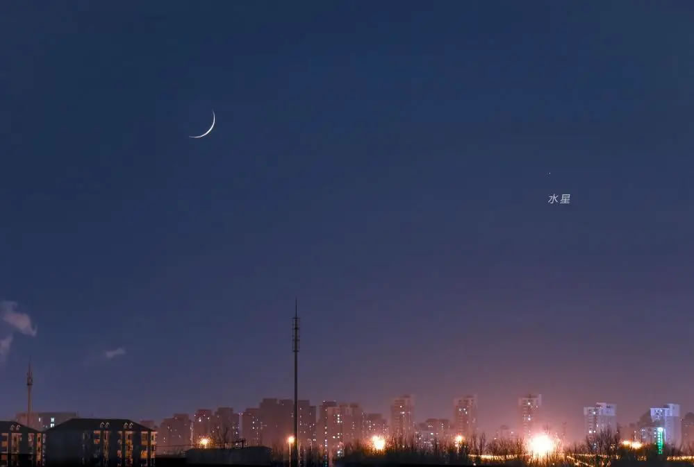 23日21時(shí),火星合月;24日零時(shí),水星合月。23日日落時(shí)分,在西南方同一片天區(qū),火星、水星和蛾眉月會(huì)近距離“相遇”并形成“雙星拱月”之勢(shì),其中,火星的地平高度最高,水星其次,蛾眉月最低。