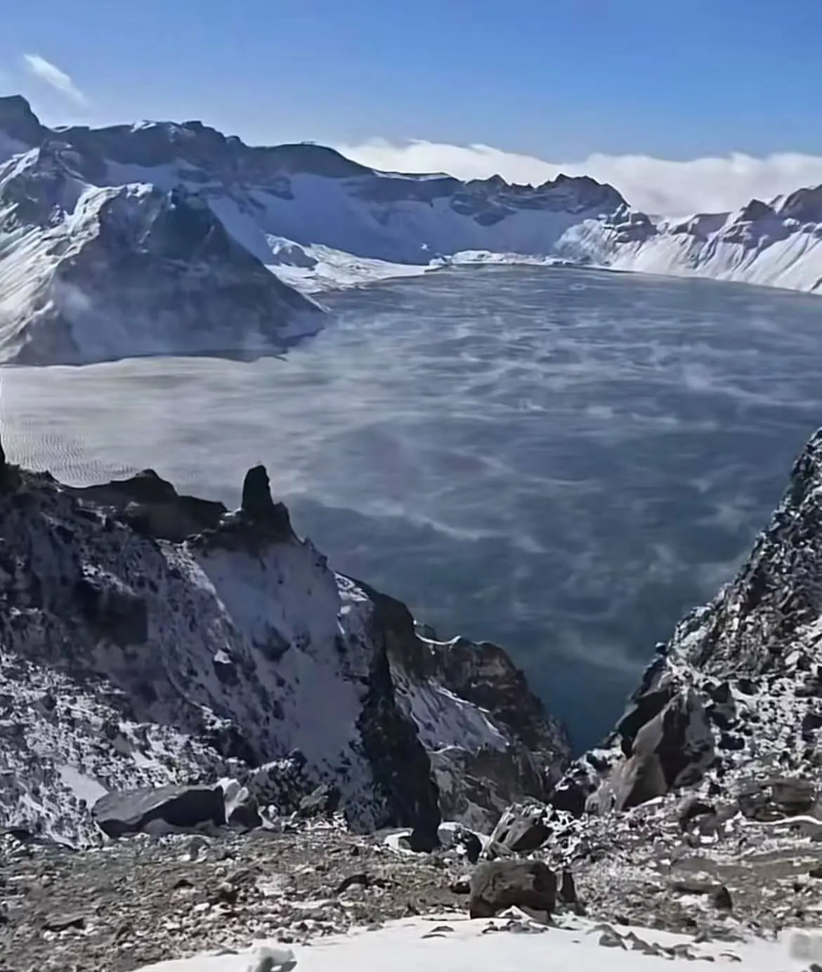 長(zhǎng)白山景區(qū)的一位導(dǎo)游晚晚(化名)當(dāng)天也目睹了“海浩”的奇觀。10月20日上午9點(diǎn)左右,她跟隨景區(qū)工作人員前往天池附近清理道路積雪,來到北坡一觀景臺(tái)處時(shí),看到在大風(fēng)吹拂下,凝結(jié)的水蒸氣正貼著天池的水面擴(kuò)散、飄動(dòng)。