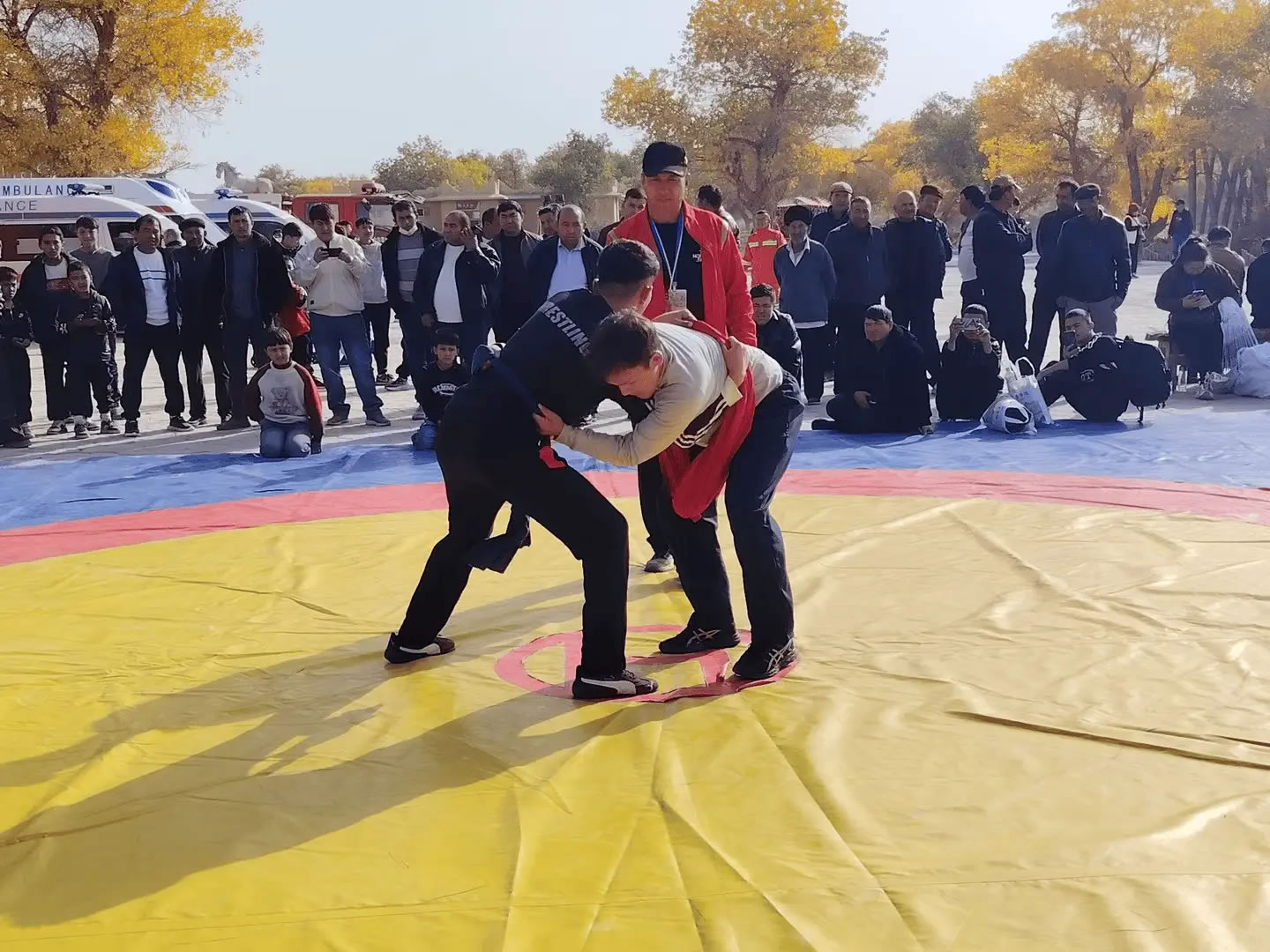 活動(dòng)當(dāng)天,且力西比賽現(xiàn)場(chǎng)熱鬧非凡,眾多體育愛(ài)好者與游客紛紛圍攏,目光緊盯著賽場(chǎng)。隨著裁判一聲哨響,摔跤手們迅速進(jìn)入狀態(tài),或蹲下身子穩(wěn)步試探,或主動(dòng)出擊鎖住對(duì)方肩膀。抱腰、絆腿、過(guò)肩摔……一系列技巧動(dòng)作如行云流水,剛勁有力又不失靈活。每當(dāng)有精彩對(duì)決上演,場(chǎng)邊便爆發(fā)出陣陣喝彩與加油聲,不少觀眾舉起手機(jī),記錄下這難忘的瞬間。