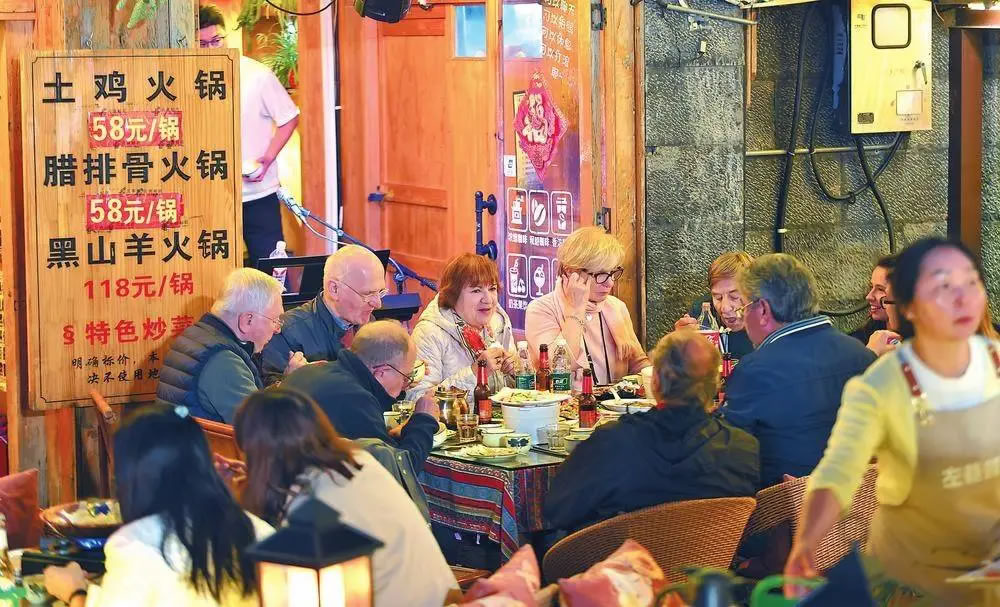 憑借優(yōu)美風(fēng)光、濃郁風(fēng)情、獨特文化體驗和日趨完善的服務(wù),麗江吸引眾多外國游客前來體驗“有一種叫云南的生活”。據(jù)麗江市公安局出入境管理支隊統(tǒng)計數(shù)據(jù),今年以來,全市臨時入境人員達78.97萬人次,同比增長47%。圖為外國游客在麗江古城品嘗美食。(記者 陳飛)