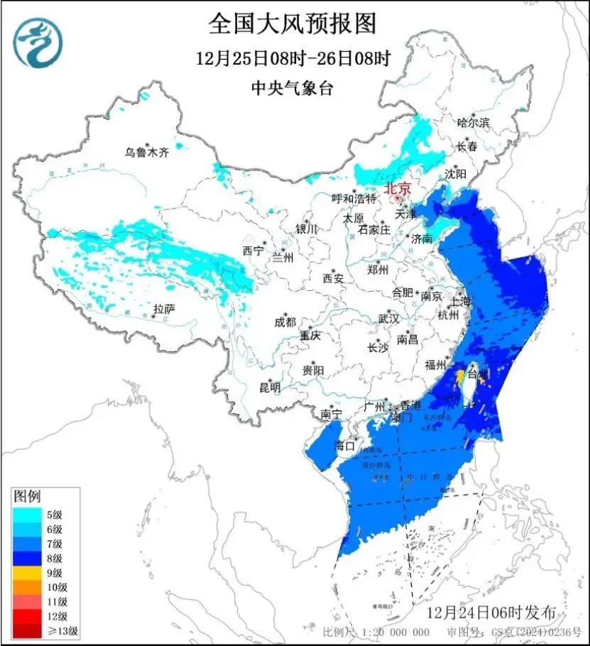中央氣象臺今晨繼續(xù)發(fā)布大風藍色預(yù)警:今天,西藏中西部、青海南部、內(nèi)蒙古中東部、河北北部、遼寧西部和遼東半島、山東半島等地有5~6級風,陣風7~8級;渤海、渤海海峽、黃海、東海、臺灣海峽、臺灣以東洋面、巴士海峽、南海大部海域、北部灣將有7~8級、陣風9~10級的大風,其中,臺灣海峽、臺灣以東洋面、巴士海峽部分海域風力可達9級、陣風10~11級。