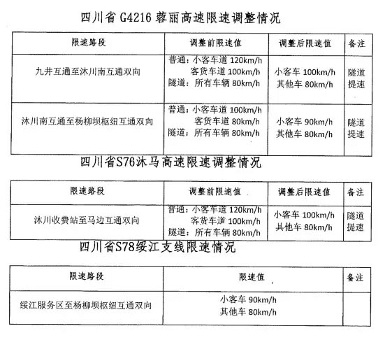 S76沐馬高速沐川收費站至馬邊互通雙向限速調(diào)整。調(diào)整前,小客車道限速每小時120公里,客貨車道限速每小時100公里,隧道內(nèi)所有車輛限速每小時80公里。調(diào)整后,全路段(包括隧道)小客車限速每小時100公里,其他車輛限速每小時80公里。