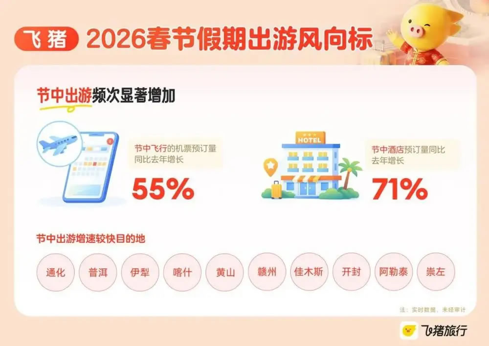 美團(tuán)旅行數(shù)據(jù)顯示,2026年春運(yùn)期間,“反向過年”的車票預(yù)訂量增長(zhǎng)明顯。2月初至2月中下旬,“反向過年”的機(jī)票預(yù)訂量同比增長(zhǎng)84%。春節(jié)假期的火車票雖未開售,預(yù)約單量也增長(zhǎng)過半。從機(jī)票的預(yù)訂情況看,“反向過年”Top10熱門目的地為北京、上海、成都、重慶、廣州、深圳、昆明、西安、杭州、天津。