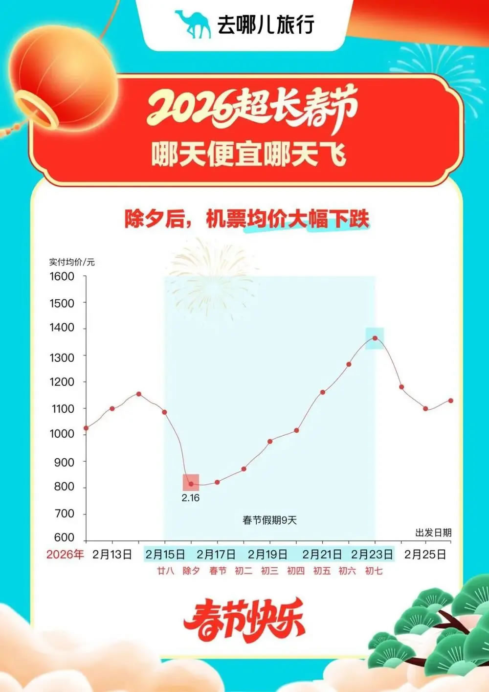 另據(jù)去哪兒旅行大數(shù)據(jù),進(jìn)入2月9日(農(nóng)歷臘月二十二)節(jié)前一周,預(yù)訂機(jī)票出行的旅客量就開始逐日增加,到2月14日(二十七)達(dá)到節(jié)前高峰。機(jī)票價(jià)格則跟出行量成正比,到2月15日(二十八)春節(jié)假期第一天,機(jī)票價(jià)格開始回落,2月16日(二十九,即除夕)降至節(jié)日期間最低點(diǎn),17日-19日機(jī)票價(jià)格都相對(duì)劃算。