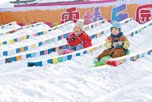 龍?zhí)豆珗@冰雪節(jié)雪橇樂園吸引小朋友來體驗。