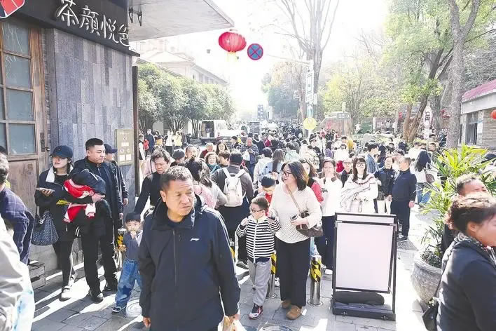 2月20日,武漢市武昌區(qū)曇華林人聲鼎沸,大批外地游客前來領略武昌老城的獨特魅力。 (湖北日報全媒記者 何宇欣 攝)