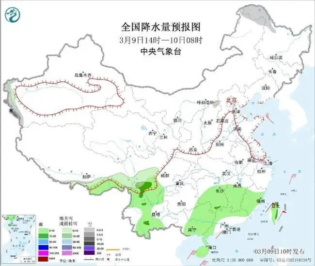 圖1全國(guó)降水量預(yù)報(bào)圖 (3月9日14時(shí)-10日08時(shí))