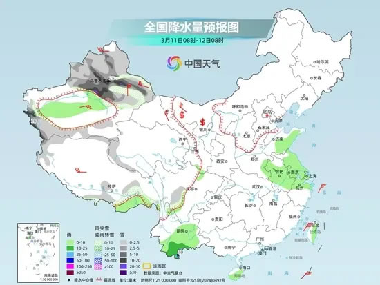 具體來看,中央氣象臺預(yù)計(jì),今天新疆北部和南疆山區(qū)、西藏西北部和東部等地部分地區(qū)有小到中雪或雨夾雪,其中,新疆沿天山地區(qū)和南疆西部山區(qū)等地部分地區(qū)有大到暴雪,局地大暴雪。新疆南疆盆地、西藏東南部、山東中東部、蘇皖大部、浙江北部、云南中東部、海南島等地部分地區(qū)有小到中雨,其中,云南西南部等地部分地區(qū)有大雨。