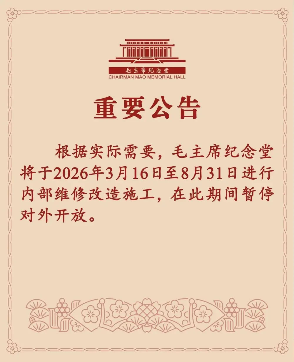 3月13日,毛主席紀念堂發(fā)布公告,3月16日至8月31日內部維修改造施工,期間暫停對外開放。