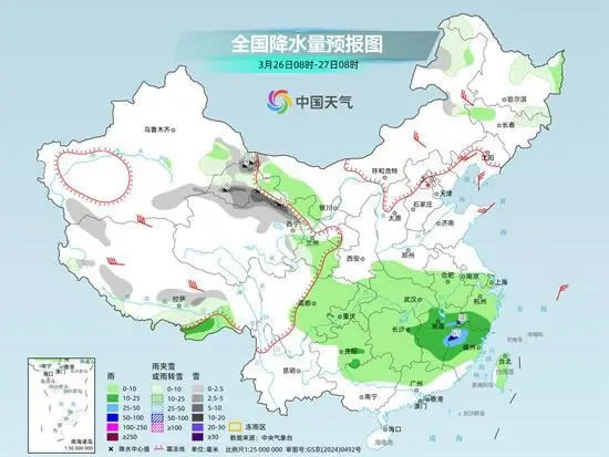 昨天,南方降雨范圍有所縮減,降雨強度減弱,部分地區(qū)現(xiàn)中雨或大雨,同時青藏高原和新疆等地降雪增多、增強。監(jiān)測顯示,24日8時至25日6時,新疆北部、青海東部和南部、西藏東部、四川西北部等地部分地區(qū)出現(xiàn)小到中雪或雨夾雪,新疆、青海等地局地大雪或暴雪,新疆烏魯木齊局地大暴雪。此外,貴州南部、湖南東南部、江西東部、浙江中南部、福建北部等地出現(xiàn)中雨或大雨,局地暴雨。