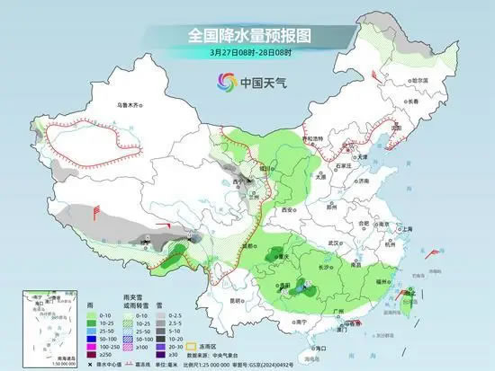 具體來看,中央氣象臺預(yù)計,今天,新疆東南部和沿天山地區(qū)東段、西藏東部、甘肅西部、青海大部、川西高原中北部、內(nèi)蒙古東北部等地部分地區(qū)有小到中雪或雨夾雪,其中,新疆東南部和沿天山地區(qū)東段、青海東部、甘肅西南部等地部分地區(qū)有大到暴雪,局地大暴雪;江南中西部、貴州東部、西藏東南部等地部分地區(qū)有中到大雨,其中,貴州中部、湖南中部等地部分地區(qū)有暴雨。