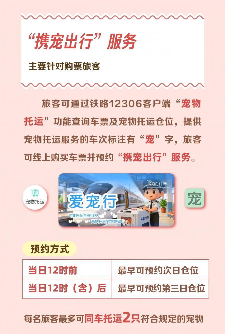 其中,“攜寵出行”服務(wù)主要針對(duì)購票旅客,旅客可通過鐵路12306客戶端“寵物托運(yùn)”功能查詢車票及寵物托運(yùn)倉位,提供寵物托運(yùn)服務(wù)的車次標(biāo)注有“寵”字,旅客可線上購買車票并預(yù)約同車寵物托運(yùn)服務(wù),每日12時(shí)前最早可預(yù)約次日倉位,12時(shí)(含)后最早可預(yù)約第三日倉位,每名旅客最多可同車托運(yùn)2只符合規(guī)定的寵物。