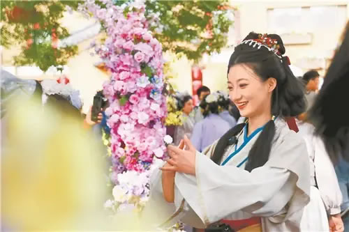 4月15日,游客在開封清明上河園景區(qū)“大宋簪花游園會(huì)”上游玩。本報(bào)全媒體記者 王錚 攝